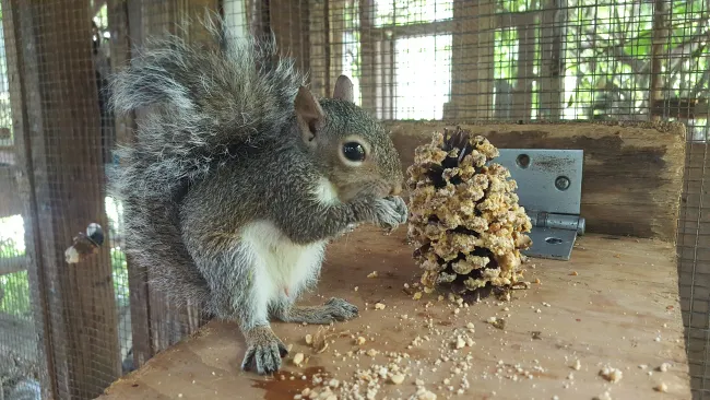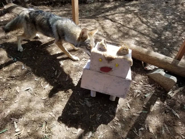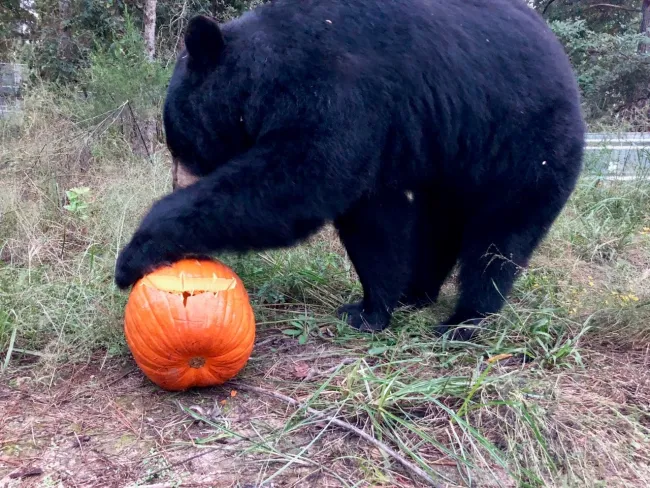 These animals are resilient and eager to take advantage of the enrichments we provide, including at Halloween time. As Deborah Robbins Millman, SFWC Director of Operations, explains, “the enrichment items, including carved pumpkins and peanut butter and nut-stuffed pinecones, keep our patients actively engaged and encourage the foraging behaviors they’ll need to thrive in the wild. Jack-o-lanterns are not only a Halloween icon, they also provide crevices for paws to dig out tasty pulp and seeds. Once the delicious morsels are consumed, the shells stimulate exercise, hiding and other positive, natural behaviors.”