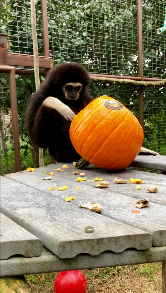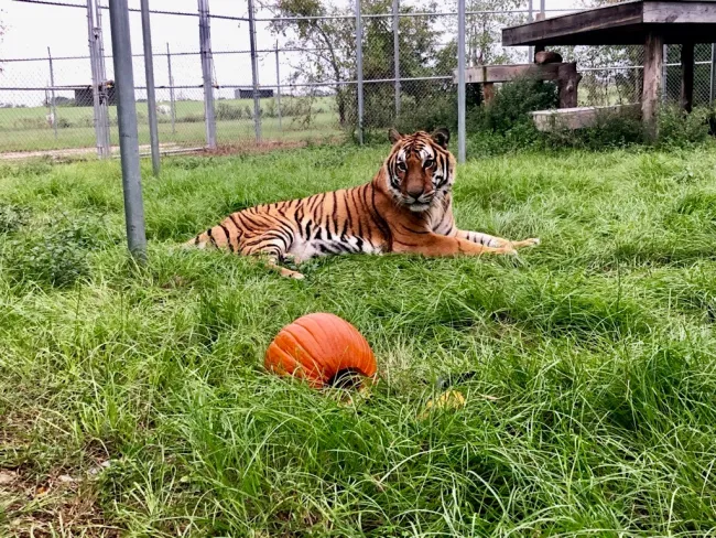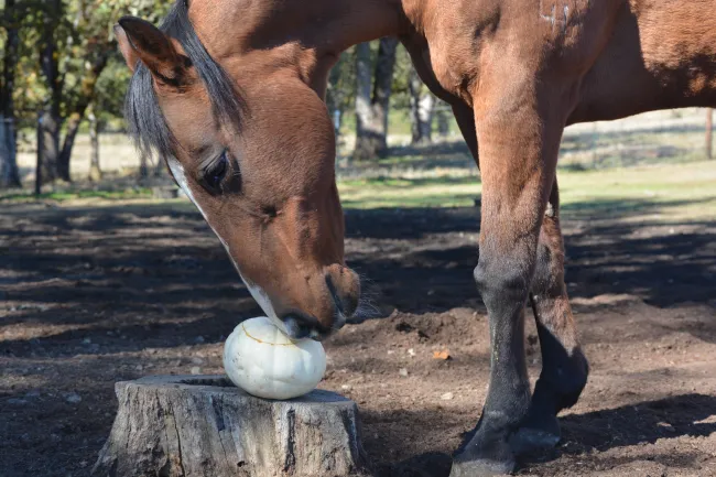 With Halloween upon us, the residents of wildlife sanctuaries and animal rehabilitation centers associated with the Humane Society of the United States and our affiliates are busy trick or treating. They are snacking on peanut butter and nuts stuffed inside pine cones, bringing down pinatas filled with goodies, and tearing apart goodie bags. And as you can see here, no one – be they burro, horse, squirrel, bear, tiger or coyote – can resist carving up a delicious pumpkin.