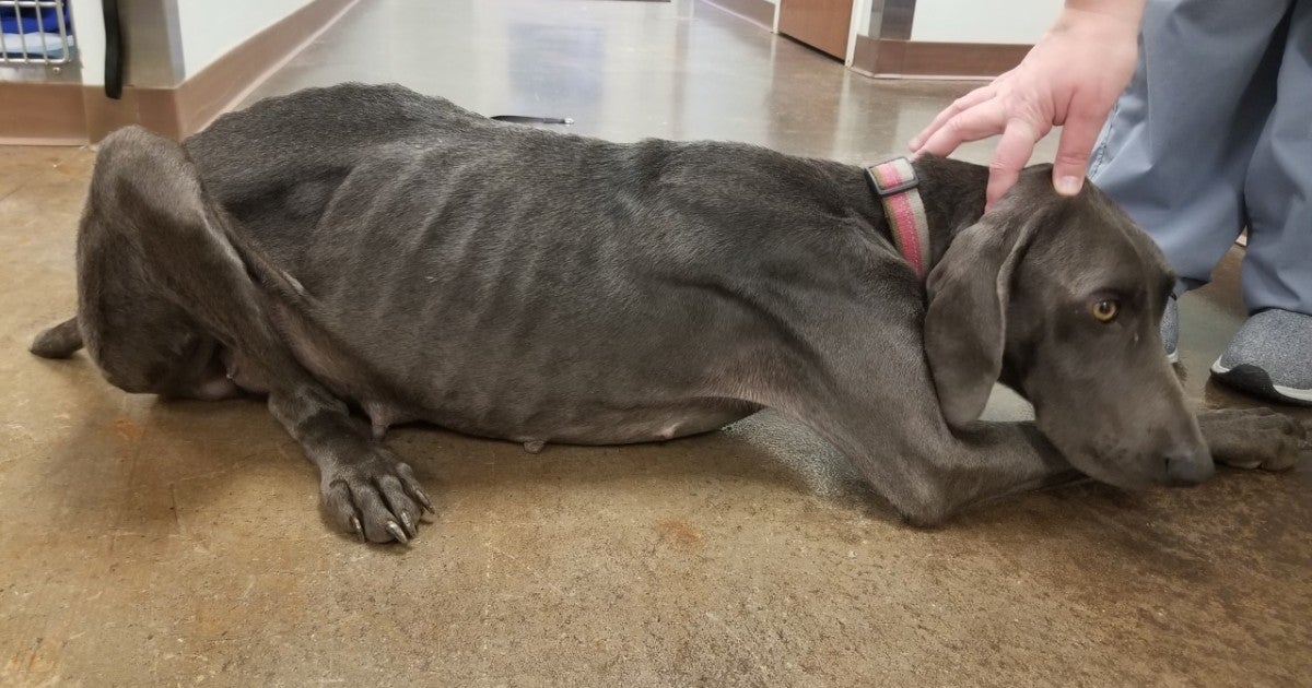 She was recently rescued from an AKC breeder in Caldwell County, North Carolina, along with more than 30 other dogs. When her rescuers found her, she was all skin and bones, riddled with parasites and lethargic. She was also pregnant with seven puppies, four of whom died at birth; the remaining three required hospitalization and round-the-clock care to survive.
