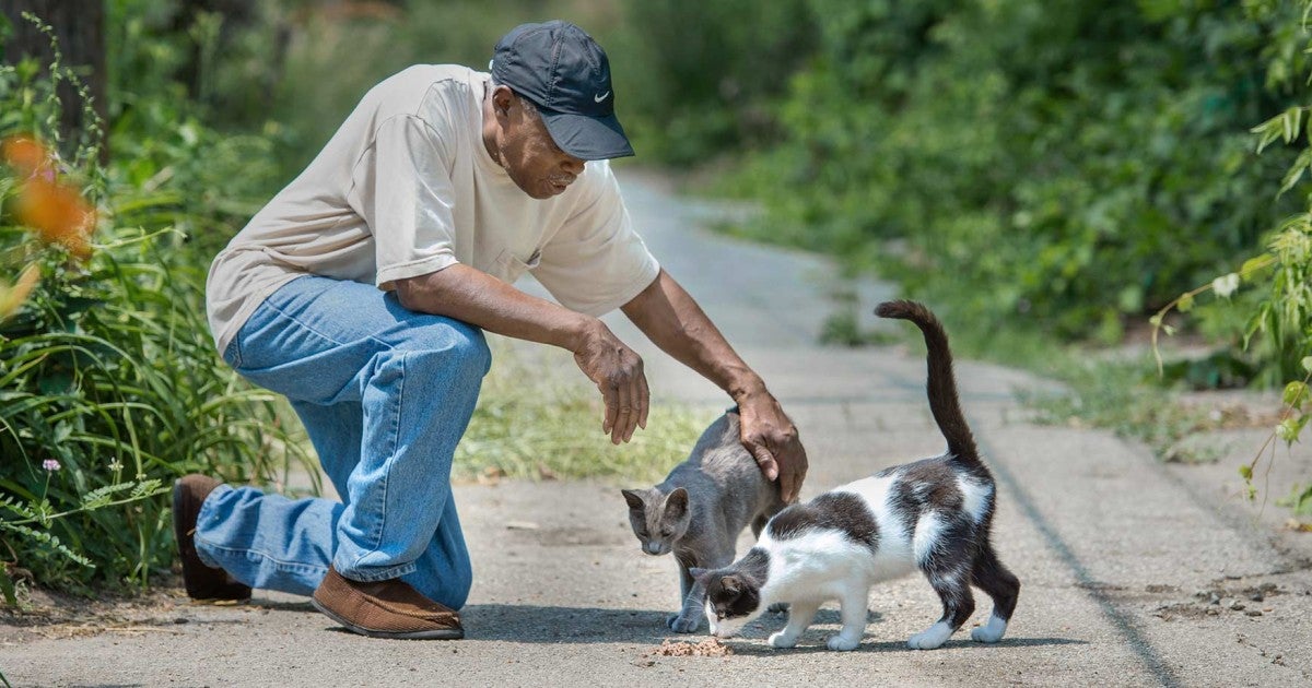 On the last stop of Schipkowski and Mutch’s visit, they go with Huston and All About Animals’ Catherine Garrett to visit Laward Ellison. Ellison, a retiree, has long had a kind heart for the many cats he sees wandering his neighborhood. Next to his house sits an old van he’s converted into a cat shelter, complete with blankets and hiding places. At least four cats poke their heads up from various nooks and crannies as the team peeks in, and more cats follow him into the backyard, where he has additional shelters to keep them warm.