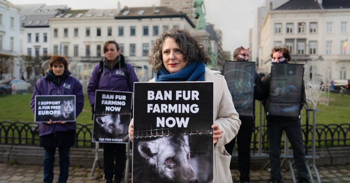 BRUSSELS―With just a week to go before the European Commission is due to deliver its formal response to the European Citizens’ Initiative petition for an EU-wide fur farming ban, animal protection organizations, members of the Fur Free Alliance and MEPs gathered opposite the European Parliament to highlight the suffering of animals exploited for fur fashion. More than 1.5 million EU citizens signed the ECI petition for a Fur Free Europe which could end the suffering of 10 million foxes, raccoon dogs, mink and chinchilla on EU fur farms each year.