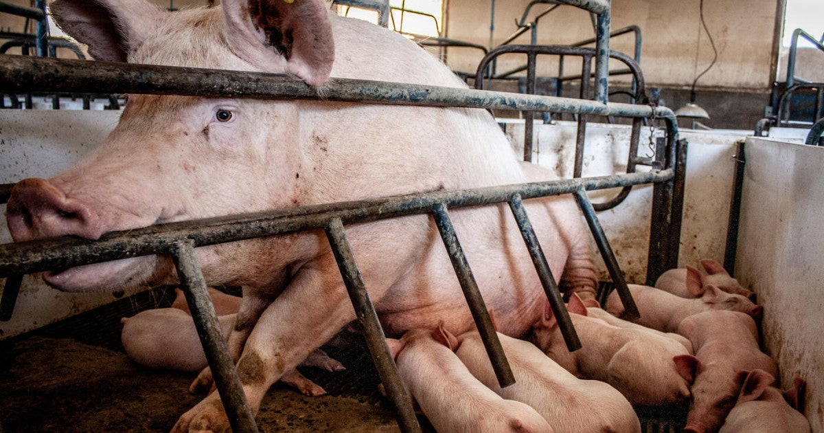 Pigs are intelligent, highly social animals, yet many sows (female pigs) around the world are treated as piglet-producing units at factory farms that use intensive confinement systems. These sows suffer through rapid cycles of impregnation, giving birth, and nursing.