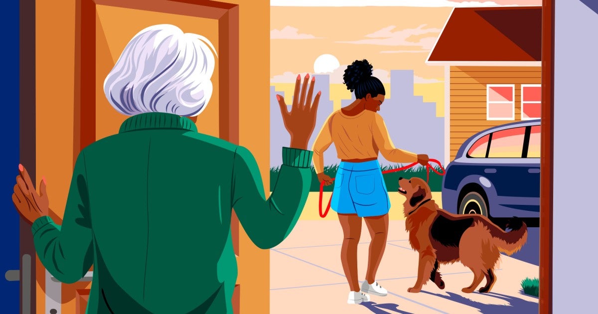 Illustration of a woman standing in her doorway, waving goodbye to another woman walking away with a dog.